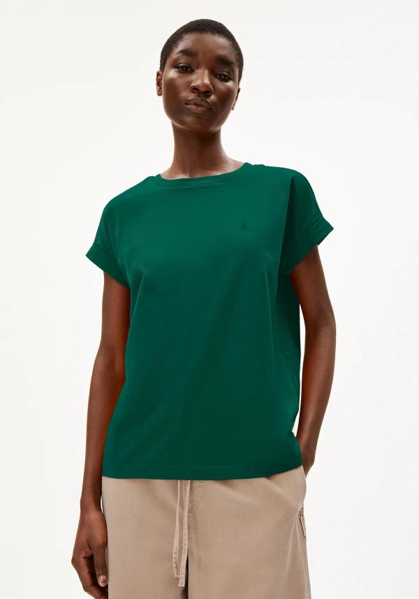 Het Idaara Emerald Green T-shirt van Armedangels is een donkergroen losvallend shirt van biologisch katoen met wijdere mouwtjes met omslag en een ronde hals. Het T-shirt is gemaakt van stevig biologisch katoen en heeft een geborduurd logo op de borst in dezelfde kleur als het shirt. Idaara is een veelzijdig, comfortabel T-shirt wat je makkelijk kan stijlen op verschillende modellen broeken en rokken. Een fijne aanvulling op je garderobe waar je geheid het hele jaar plezier van hebt!