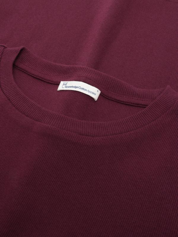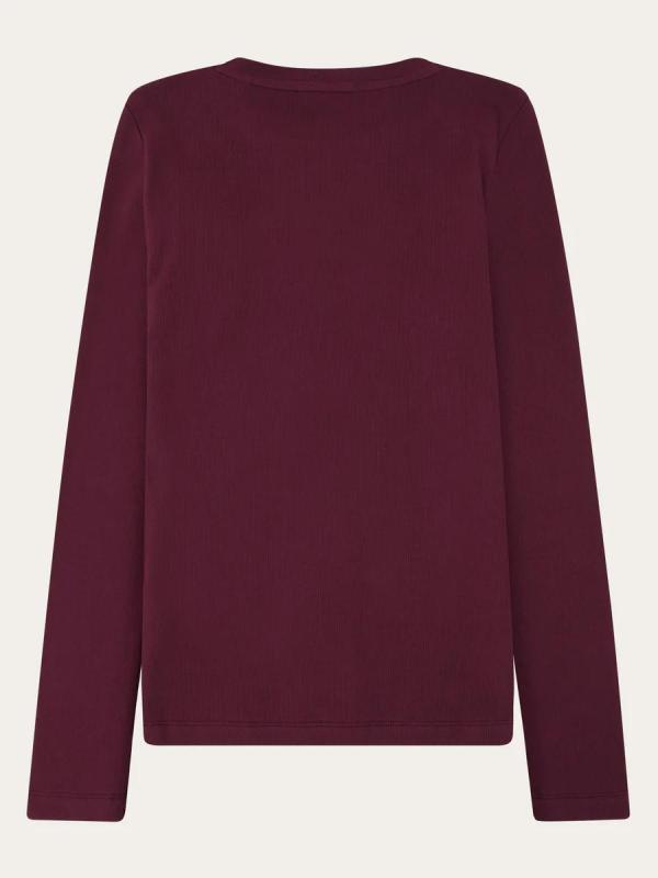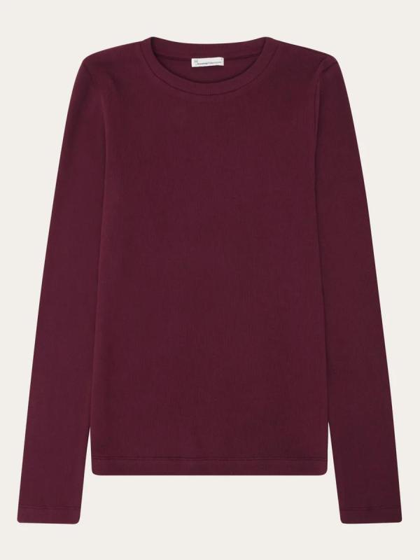 De Rib Scoop Neck Longsleeve van KnowledgeCotton Apparel is gemaakt van geribde stof in de donkerbruine kleur ‘Fig’. De longsleeve is gemaakt van biologisch katoen met een beetje elastaan voor een comfortabele fit en maakt het shirt soepel, ademend en duurzaam. Dit mooie paars/bordeauxrode shirt met haar warme kleur is een heerlijke toevoeging aan vele outfits. Je kunt de longsleeve goed stijlen met een mooie jeans, rok of pantalon. De Rib Scoop Neck staat ook prachtig onder een vest of blazer.